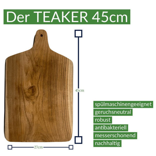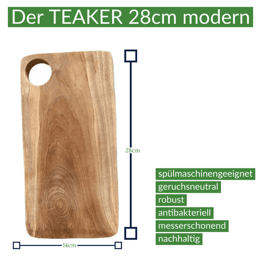Der TEAKER löst dieses Problem: Aus einem einzigen Stück Teak gefertigt, frei von Leimen und Schadstoffen, antibakteriell und robust genug für die Spülmaschine. Ein Schneidebrett, das praktisch, gesund und schön zugleich ist – und Ihnen jeden Tag Freude bereitet.